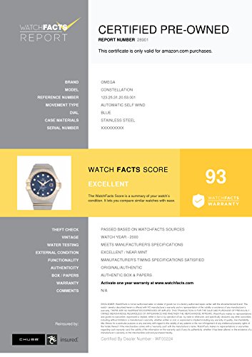 -. Feature : Omega Constellation 123.25.31.20.53.001 with blue dial / Authenticated by WatchFacts. Grade Rating: 93 / Condition: Excellent / Comes with original box and manufacturer's papers offered with this watch / Automatic-self-wind movement / Watch year: 2000