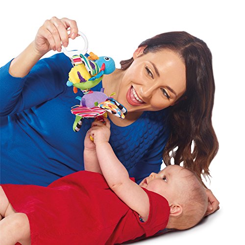 Flutterbug stretches, dances and wiggles back onto his flower! Simply pull the rings at each end to stretch him out then watch it wiggle and fly back together again. Flutterbug’s satin legs and woven wings have fun patterns and bright colors. Includes crinkly, textured flower petals and clanking rings for hours of discovery and play. The Lamaze clip lets you hook Flutterbug to strollers, carriers and diaper bags to take him along for on-the-go fun.Feature