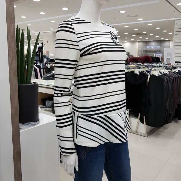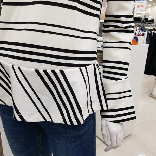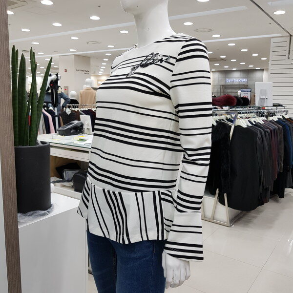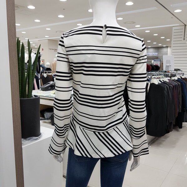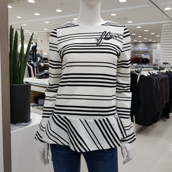 스트라이프 로 소매 끝단과 허리 밑단을 나팔로 디자인 되어 귀여우면서도 세련된 티셔츠겸 블라우스입니다