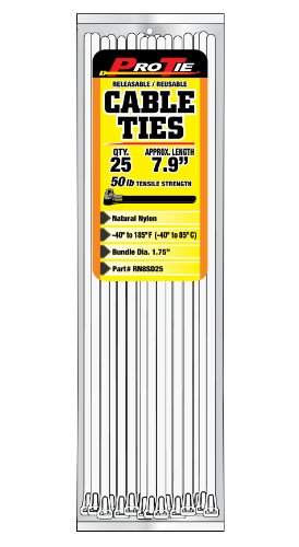 Pro Tie RN8SD25 7.9-Inch Natural Nylon Releasable Standard Duty Cable Ties, 25-Pack