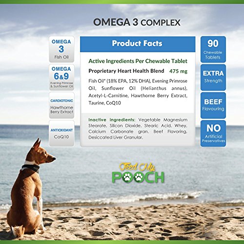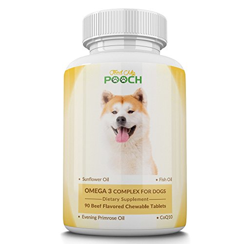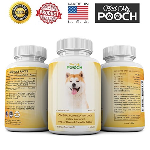 -. Feature : OMEGA 3 FOR DOGS - Advanced fish oil supplement for dogs - tasty and easy to chew treats for skin, coat, joint and heart health with a special mix of ingredients for overall canine well-being. / BETTER DOG HEALTH - A combination of antioxidant CoQ10, Hawthorne berry extract, evening P.R.Imrose oil, sunflower oil and fish oil, help in providing dietary EPA and DHA essential fatty acids for dogs. Omega 3,6,9 complex use may include dry and itchy skin, dull fur coat, cardiovascular system and joint support. / FOR ALL DOGS - Feed My Pooch's fish oil for dogs can be used in all canine types - young, old, small and large. This dog fish oil supplement comes with dosage instructions to suit your dog's specific requirements. / CHEWABLE TABLETS - 90 beef flavored chewable tablets for easy ingestion and fast action. / SAFE PRODUCT - Our Omega 3 pet supplements are proudly made in the USA to Good Manufacturing Practice standards. Feed My Pooch operates a 100% money back guarantee.