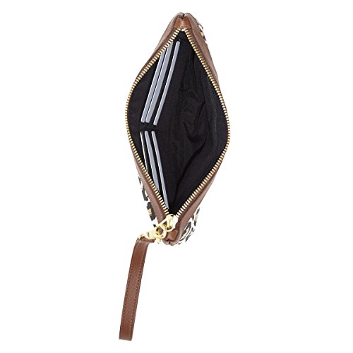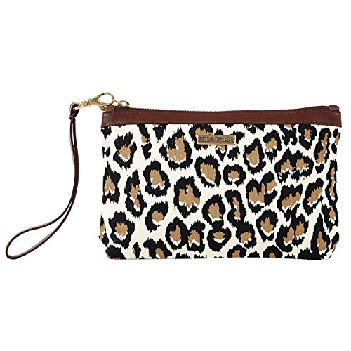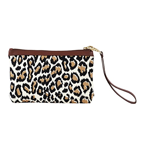 Product Description Walk on the "wild" side with our Sahara line of printed canvas bags and accessories. With the Wristlet Pouch, carry more than just cards, cash and coins with a roomy interior perfect for holding lipstick, large cellphones, gum and keys. Hardware is antique brass. Inside features 1 zip pocket, 8 credit card slots and 1 cash slot. The wristlet strap is 12x.375" with a 6.5" drop. Wipe with damp cloth, spot clean where ever required. Dimensions are 5.5x9x1". 0