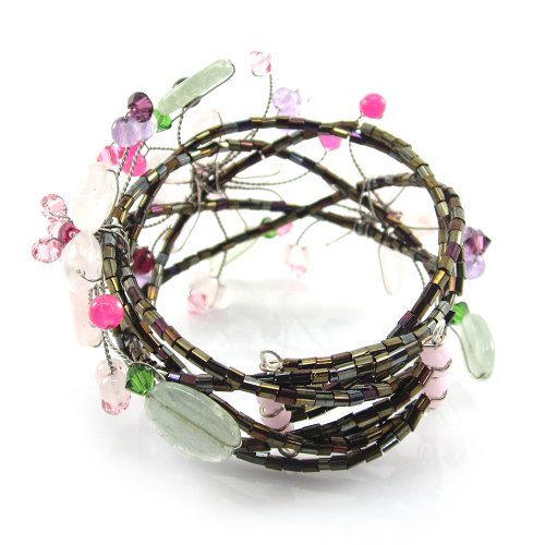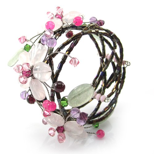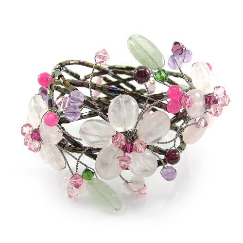 MGD, Pink Rose Quartz Color Bead and Swarovski Crystals Flower / Floral Cuff Bracelet, Adjusable Wrap Bracelet, Beautiful Handmade Fashion Jewelry for Women, Teens and Girls, JA-0109B