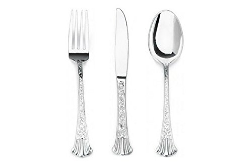 Disposable Plastic Silver Flatware Heavyweight 60 Count Elegant Cutlary Set, 20 Forks 20 Spoons 20 Knives For All Parties And Special Occasions