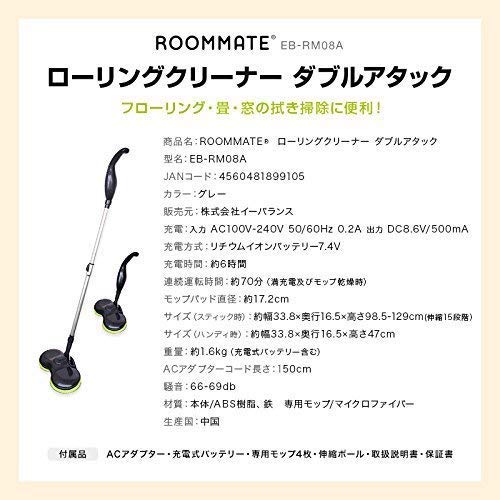 付属品:ACアダプター、充電式バッテリー、専用モップ4枚、伸縮ポール、取扱説明書、保証書
