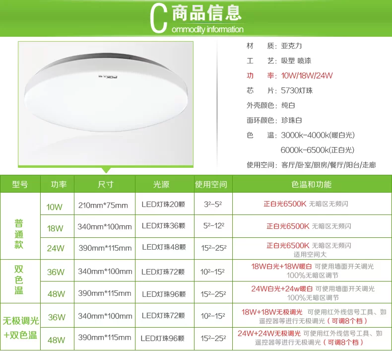 • Color classification: 18W white models (34 * 10) 10W is white (21 * 7.5) 10W is white (21 * `7.5)