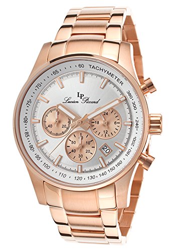 -. Binding : Watch -. Brand : Lucien Piccard -. Color : Rose/Silver -. Department : mens -. EAN : 0722630710554 -. Feature : Chronograph functions with 60 second, 60 minute and 24 hour rose gold sub dials; date window between 4:00 and 5:00 / Silver dial with rose gold tone and white hands and hour markers; luminous; tachymeter; sapphitek crystal; rose gold tone stainless steel case and bracelet / Japanese-quartz movement / Case diameter: 42mm / Water resistant to 330 feet -. Label : Lucasarts -. Manufacturer : Lucasarts -. Model : LP-12729-RG-22S -. MPN : LP-12729-RG-22S -. PackageQuantity : 1 -. PartNumber : LP-12729-RG-22S -. ProductGroup : Watch -. ProductTypeName : WATCH -. Publisher : Lucasarts -. Size : Standard -. Studio : Lucasarts -. Title : Lucien Piccard Men's LP-12729-RG-22S Camelot Analog Display Japanese Quartz Rose Gold Watch -. UPC : 722630710554