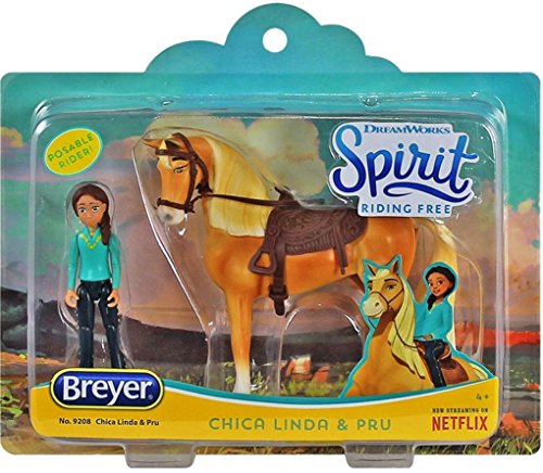 Chica Linda and Pru Small Set features an approximately 3" tall poseable Pru doll, and a 3.75" tall Chica Linda. Tack up Chica Linda with the included saddle, bridle and saddle pad, and go riding along with Pru