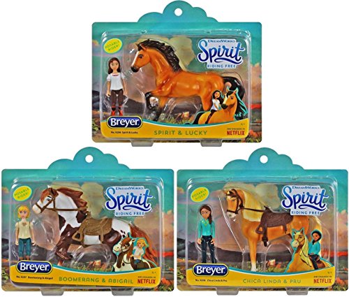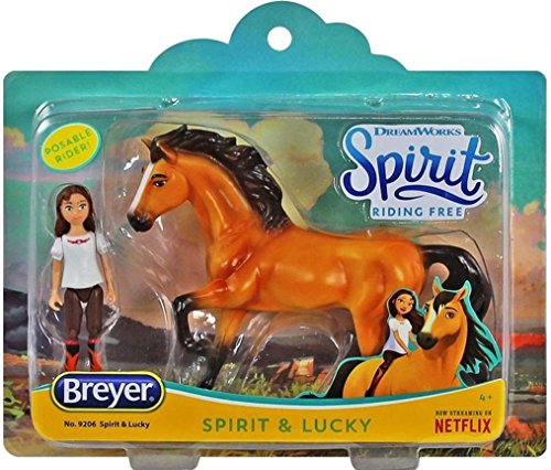 Spirit and Lucky Small Set features an approximately 3" tall poseable Lucky figure, and a 4" tall Spirit! Lucky can ride her mustang Spirit bareback and bridleless, just like on the show Spirit Riding Free!