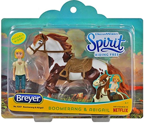Boomerang and Abigail Small Set features an approximately 3" tall poseable Abigail doll, and a 4" tall Boomerang. Tack up Boomerang with the included saddle, bridle and saddle pad, and go riding along with Abigail