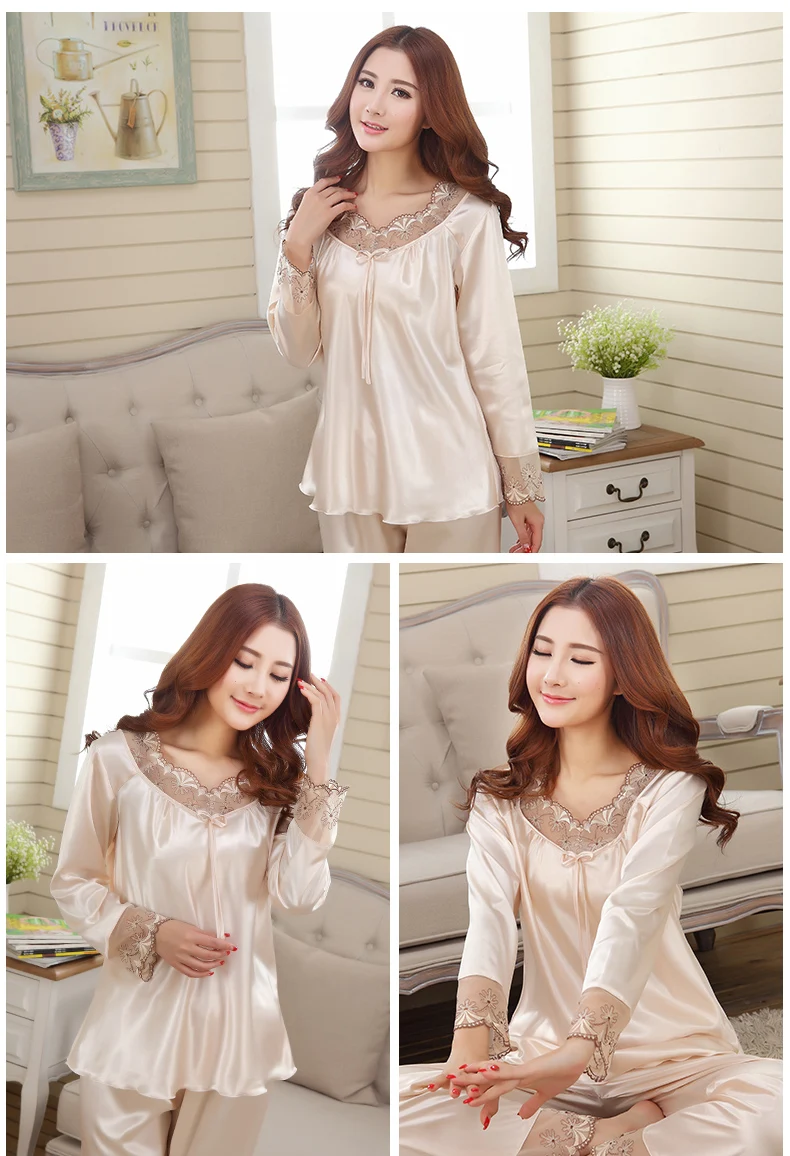 2017 New Elegant luxury Silk Pajamas For Women Solid Embroidery pyjamas women Lounge Pajama Sets Silk Satin Pijama Feminino