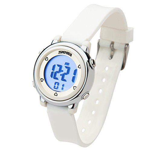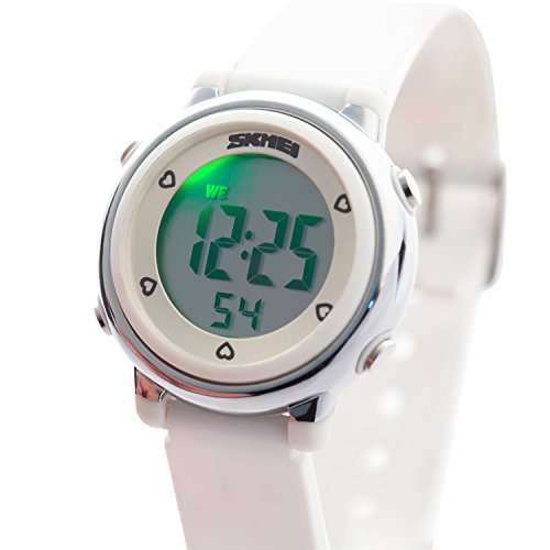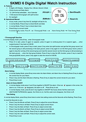 [Description] THE PERFECT FIRST WATCH Child``s watch has an easy to read LCD display screen that tells the hour_ minute_ second and day of the week SO MANY FUNCTIONS Kids`` watch can display time in 12 or 24 hour format_ includes a calendar and a 1/100 second chronograph with a split function THE Watch Even Has an EL backlight of six colors to choose from that makes it easy to read at night. BUILT-IN ALARM Hourly chime and alarm function helps kids track the hours EASY TO READ AT NIGHT EL backlight illuminates the face for easy reading in the dark