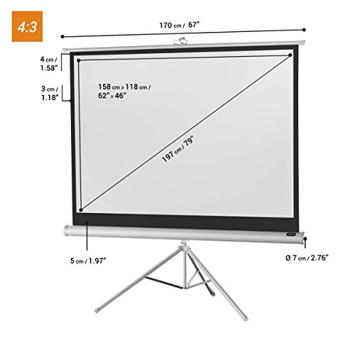 celexon portable projector screen Tripod Economy 78" - White Edition The celexon 78“ tripod projector screen is part of the celexon Tripod Economy Series, wich provides products of high quality for a good price-performance ratio. This tripod screen is adjustable in its height and available for different aspect ratios (1:1, 4:3, 16:9 formats). The screen has a gain factor of 1.0 and can be used for LCD and DLP projectors. The black back is impervious to light and ensures a perfectly clear projection. Due to the black border the screen has an increased contrast and the fabric is perfectly flat. The integrated keystone bracket enables a high quality projection without keystone distortion. Celexon tripod projector screen Tripod Economy ? Key features: - 62 x 46 inches viewing area