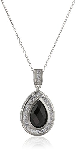 Rhodium Plated Sterling Silver Black Cubic Zirconia 12x8mm and White Cubic Zirconia Teardrop Pendant Necklace, 18"