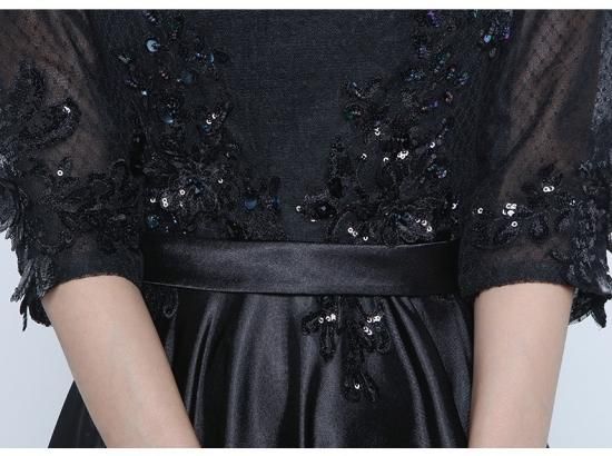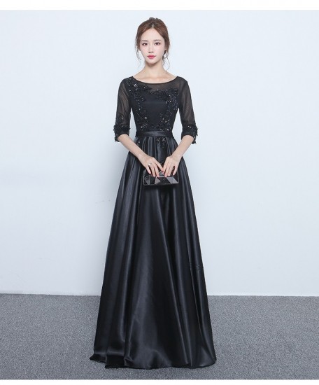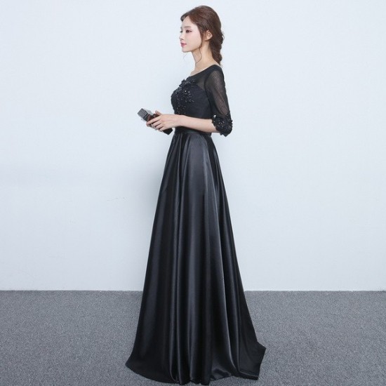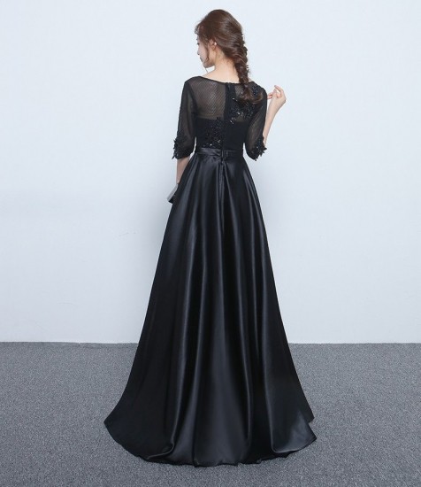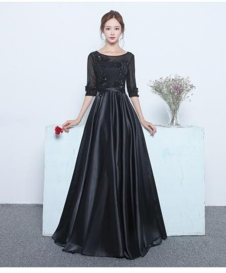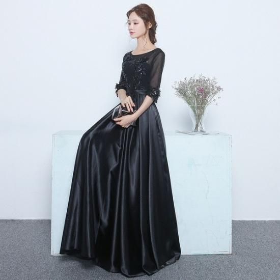 パーティードレス ロング丈 マキシ丈 ブラック シック スパンコール 七分袖 レース切り替え フレア 大人 上品 エレガント お呼ばれ drgz2223