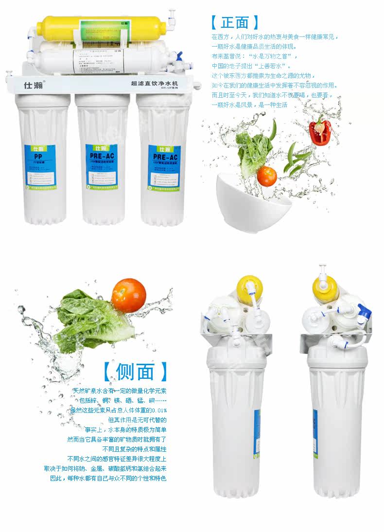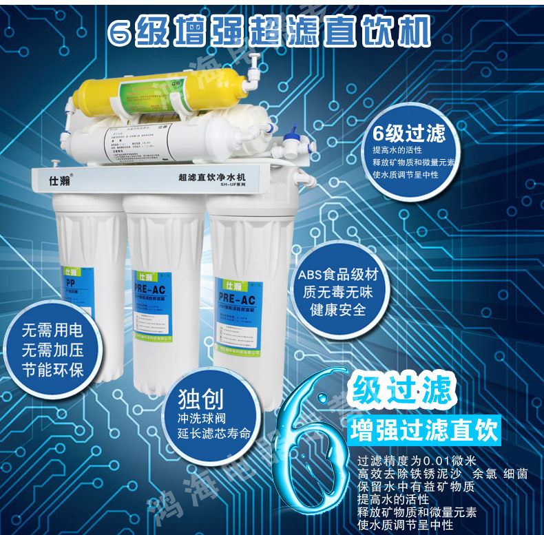 Five water purifier filter for direct drinking mineral water. Filter out all impurities, bacteria, microbes, viruses, etc., six water purifiers increase in five nano weak base running water on the basis of high-grade mineralization direct drinking water filters, filters more pure, while adjusting the PH value of water, that is water pH, water is generally slightly acidic, and the body weakly alkaline, alkaline water is more beneficial to human health