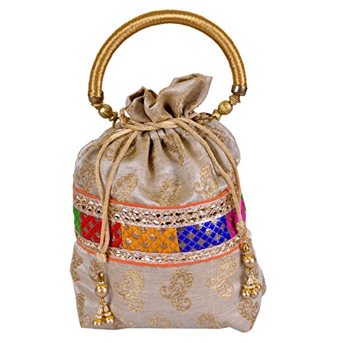 Maitri Creations Women Traditional Silk Brocade Purse Potli Bag Drawstring Jewelry Pouch Bag Cotton Gift Bag Value Set Wristlet Beaded Handbag Wedding Evening Party Designer Bridal Clutch Gold
