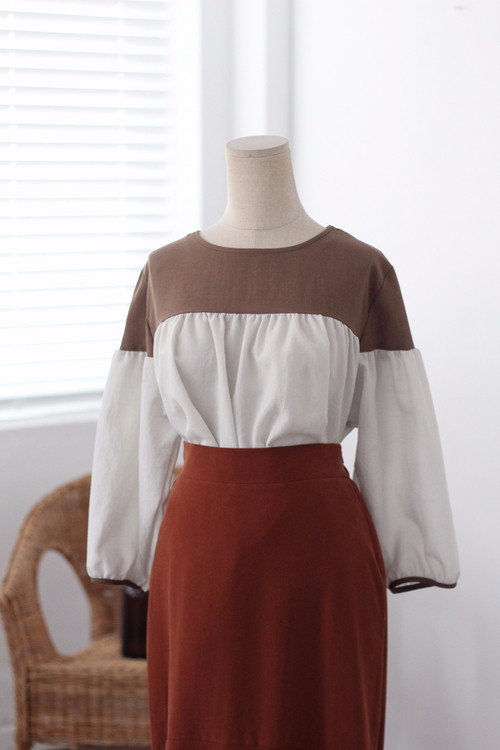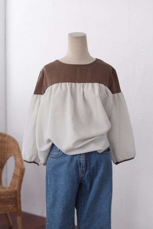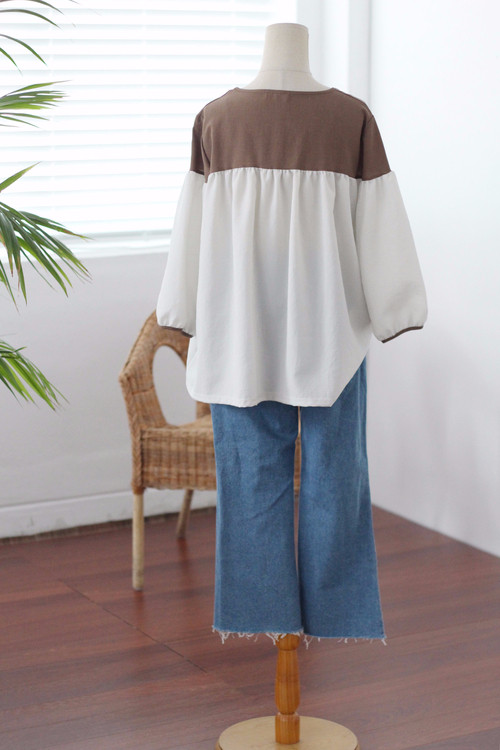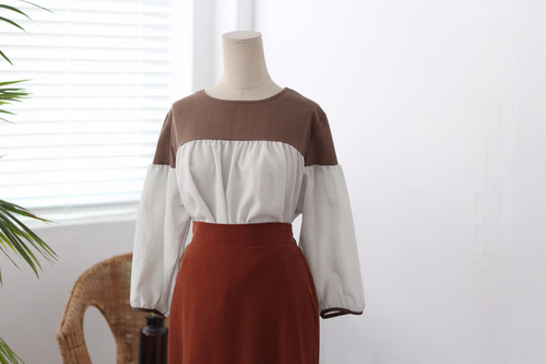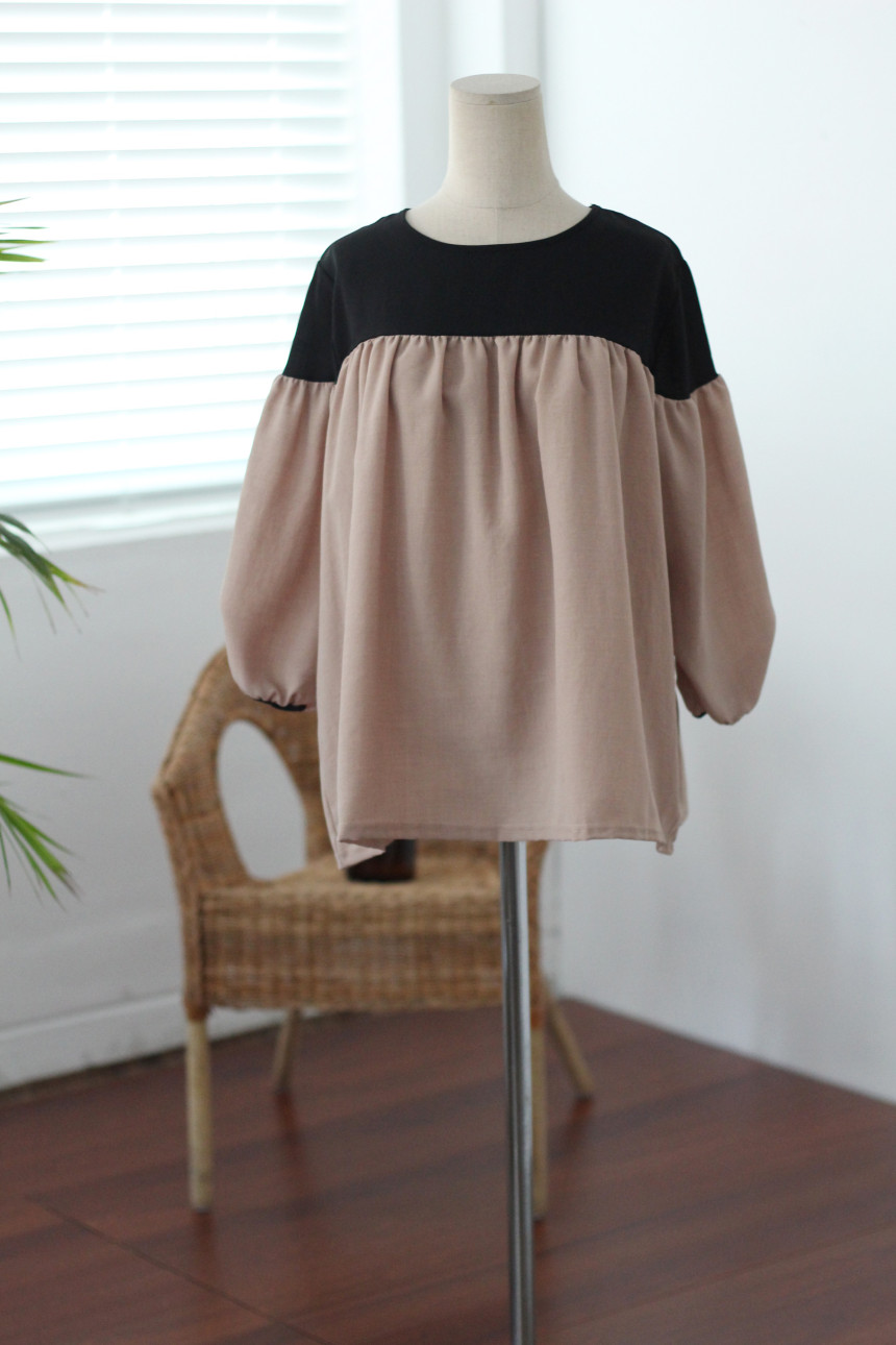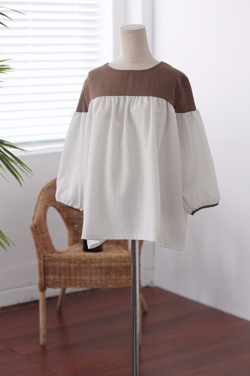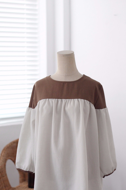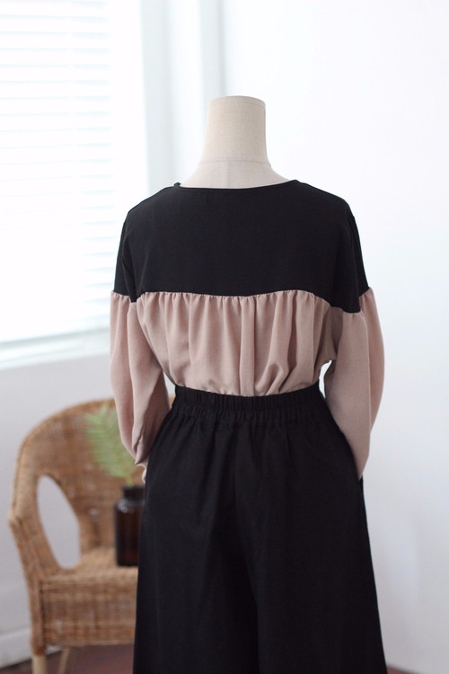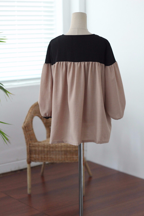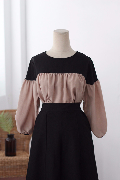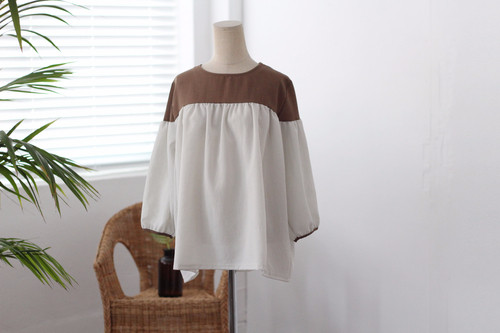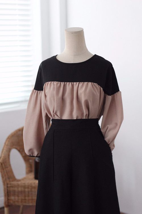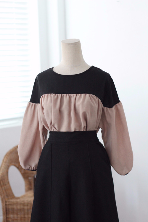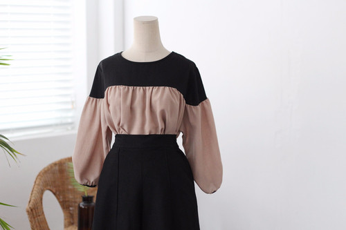 Two-tone coloring Blouse Chiffon 7 part Round neck Balloon sleeve volume