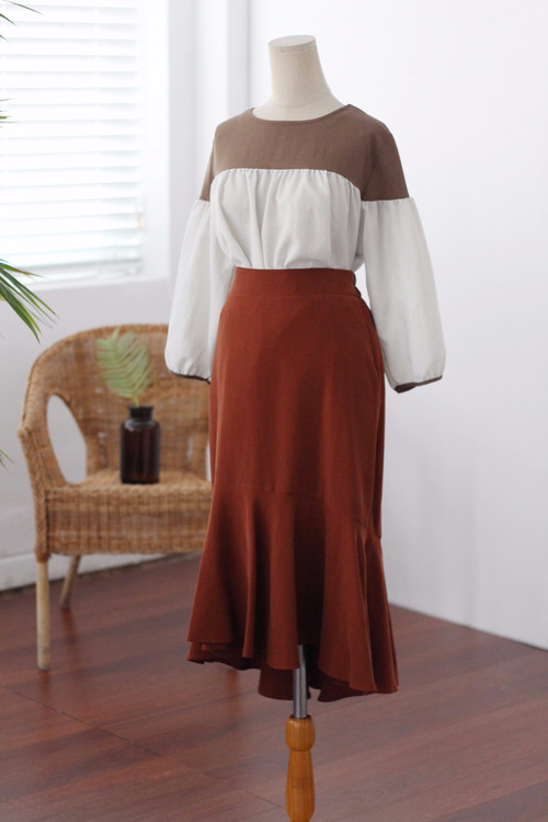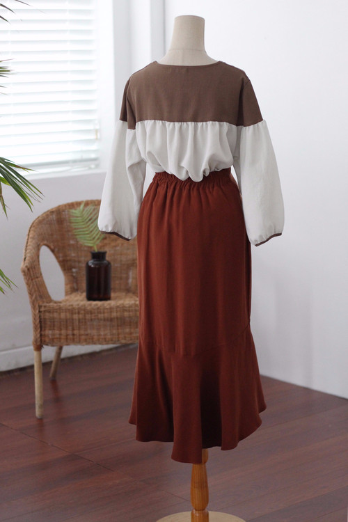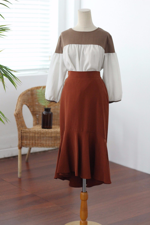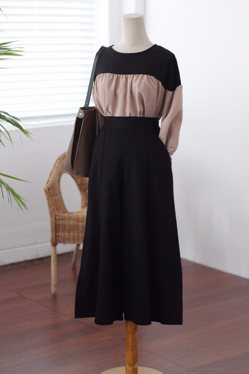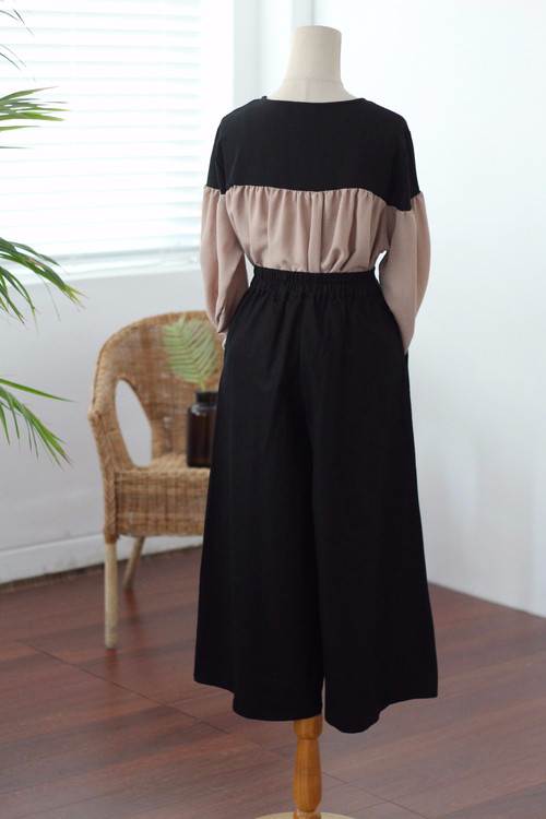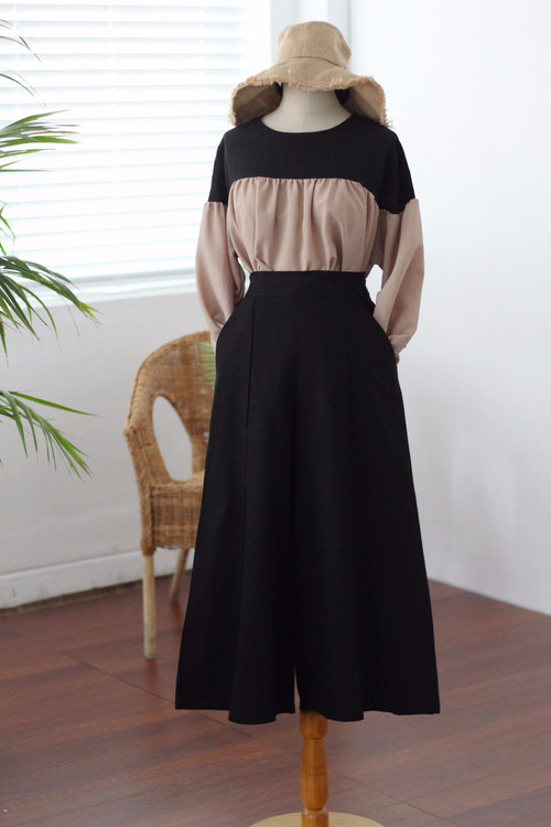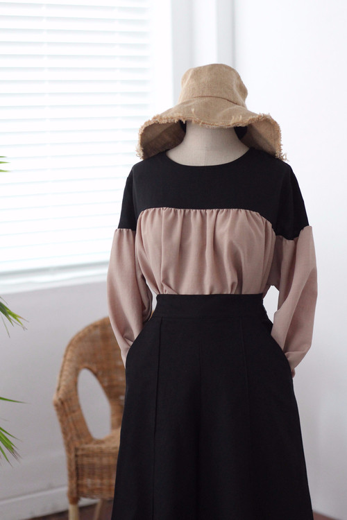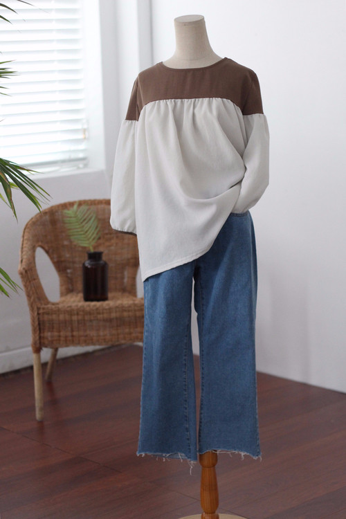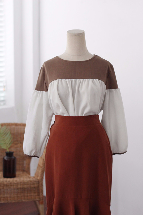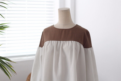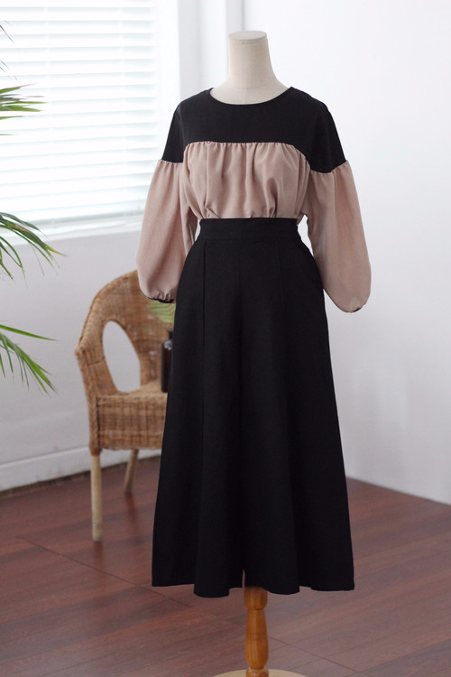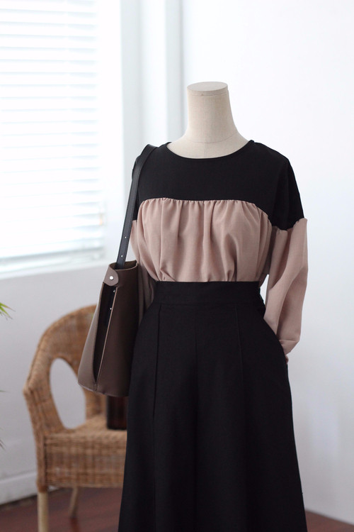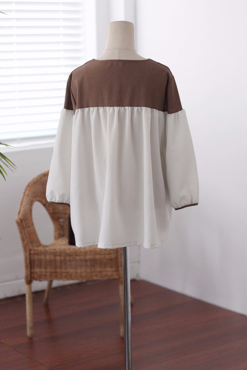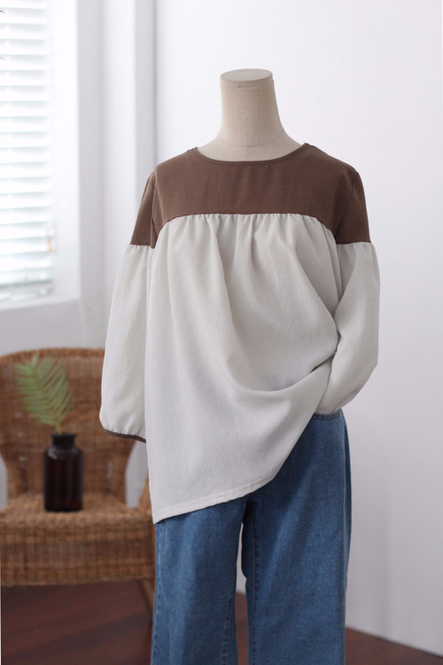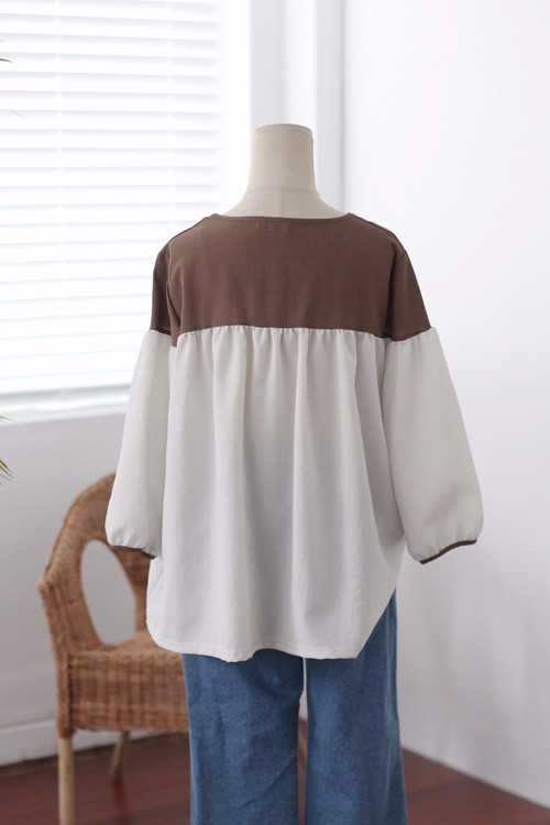 Two-tone coloring Blouse Chiffon 7 part Round neck Balloon sleeve volume