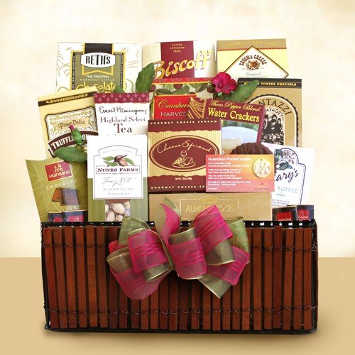 -. Feature : Includes chocolate chip cookies, tea, roasted salted pistachios, almond toffee, cheese, crackers, chocolate truffle cookies, butter toffee pretzels, cranberry harvest snack mix, Almond Roca, Biscoff cookies and Sonoma cheese straws. / This gift also includes a keepable guardian pocket angel pendant.