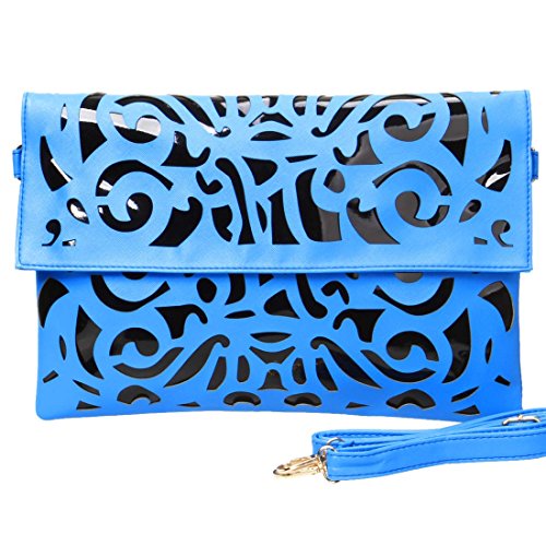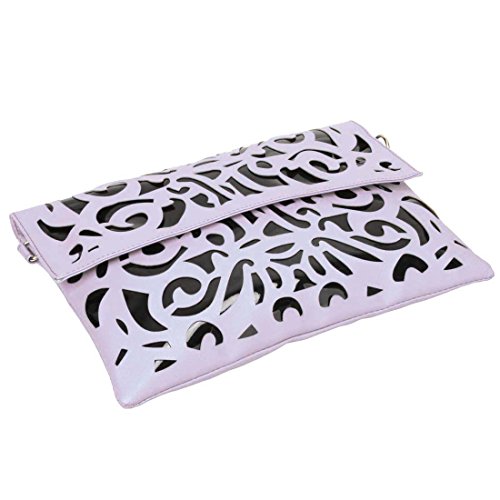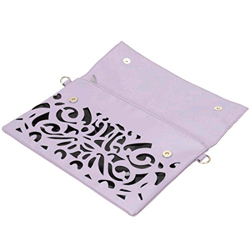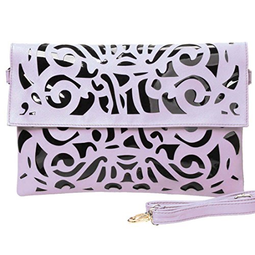 Black vinyl and lilac purple faux leather large fashion clutches with a decorative, ornate, cut-out design. Comes with a detachable shoulder strap with a max drop of 22 inches. *NOTE*: Due to differences between monitor displays, actual color may vary slightly from image. b.m.c is a registered trademark of Remi Collections LLC and is exclusively distributed by Bundle Monster. The b.m.c trademark is protected by US Trademark Law.
