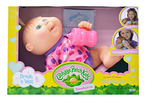 -. Binding : Toy -. Brand : Cabbage Patch Kids -. EAN : 0819798017172 -. Feature : Make room in your heart for the 11'' Cabbage Patch Kids Drink N' Wet Newborn! / Feed your Drink N' Wet Newborn by adding water to the bottle included / care for your 'Kid when a new diaper is needed / With an all vinyl body you can feed and change newborn's diaper over and over again for endless fun! / Includes: Cabbage Patch Kids Drink N' Wet Newborn, Bottle, and diaper -. IsAdultProduct : 0 -. Label : Wicked Cool Toys (Domestic) -. Manufacturer : Wicked Cool Toys (Domestic) -. Model : 30701 -. MPN : 30701 -. NumberOfItems : 1 -. PackageQuantity : 1 -. PartNumber : 30701 -. ProductGroup : Toy -. ProductTypeName : TOYS_AND_GAMES -. Publisher : Wicked Cool Toys (Domestic) -. Studio : Wicked Cool Toys (Domestic) -. Title : CabbagebPatch Kids 11" Drink N' Wet Blonde Newborn -. UPC : 819798017172 -. Warranty : No Warranty