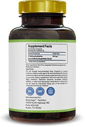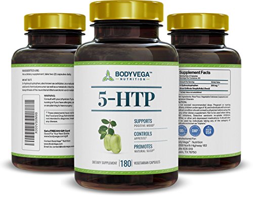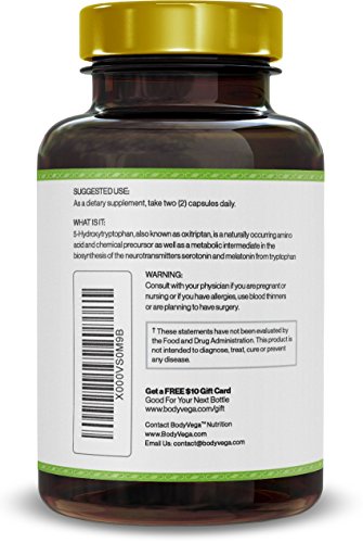 -. Binding : Health and Beauty -. Brand : BodyVega Nutrition -. EAN : 0722589334023 -. Feature : Studies sest 100mg capsules of the amino acid 5-HTP assist with sleep cycle, mood enhancement, and depression. The BodyVega 5-HTP (5-hydroxytryptophan) supplement is a vegan-friendly, time-release, fast dissolve formula great for stress relief, hunger suppression, mood, relaxation, and promotes a feel-good mentality achieved with healthy serotonin levels. Experience better sleep, and mood, with BodyVega 5-HTP. / Anyone looking to improve mood, behavior, appetite, or sleep may benefit from 5-HTP. Also anyone with symp of low serotonin levels may benefit from BodyVega 5-HTP. / 5-HTP may be especially beneficial to those on a weight management program. Additional benefits include, improved mood, improved sleep, feel good mentality, stress reduction, and relaxation. / With BodyVega you receive top-quality all-natural supplementation fully Made in the USA, preservative-free, GMO-free & with unmatched customer service. Fully NSF & cGMP certified supplementation with a 100% Risk-Free Money Back Guarantee. / If you are not fully satisfied with your order of 5-HTP, we will refund you 100% of your money, no questions asked! -. IsAdultProduct : 0 -. Label : BodyVega Nutrition -. Manufacturer : BodyVega Nutrition -. MPN : bv_5htp -. PartNumber : bv_5htp -. ProductGroup : Health and Beauty -. ProductTypeName : HEALTH_PERSONAL_CARE -. Publisher : BodyVega Nutrition -. Studio : BodyVega Nutrition -. Title : 5-HTP by BodyVega, 180 Vegetarian Capsules Per Bottle, 200mg per serving, 100mg per Pill, Extra Strength Supplement -. UPC : 722589334023