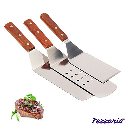 Studio : Tezzorio Publisher : Tezzorio Product Description This amazing 3 Piece Spatula Set features heavy-duty stainless steel blades with 2 face types, perforated and smooth, to cover any situation and solidly mounted wood handles for a smooth and comfortable grip. A turner is an essential item in the kitchen. Regardless of the surface, you're planning to cook on a flipper does the dirty work, flipping the food so it gets cooked evenly on each side. If you are looking for slotted kitchen utensils that you will love to use then here they are. These spatulas are perfect for restaurants, caterers, food trucks, and more. Anywhere where a flat top griddle is present, these turners are for sure to fit right in. Plus, they're easy-to-clean and durable, too! Great turners to use every day in the kitchen or at BBQ, Teppanyaki, Griddle Grill, Hibachi Grill, Camping Barbecue, Griddle Scraper, Pancake Turner. 0