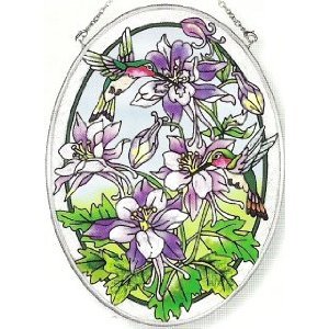 Amia 5905 Medium Oval Suncatcher with Hummingbird and Columbine Design, Hand-painted Glass, 5-1/2-Inch W by 7-Inch L