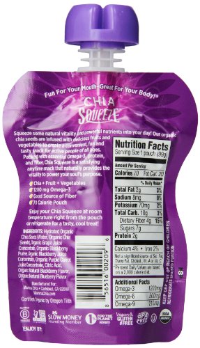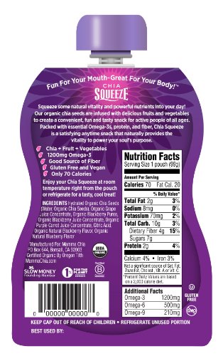 The Mamma Chia Organic Chia Squeeze Vitality Snack is a blend of Organic fruits, vegetables and Chia, the world’s most nutrient dense food, to create a deliciously satisfying anytime snack for active people of all ages. Chia Squeeze Vitality Snacks have only 70-calories and are a healthy way to provide your body with the essential nutrition it needs. Each 3.5-ounce serving contains 1200-milligrams of Omega-3 and is a source of protein, fiber and revitalizing antioxidants. Organic Blackberries join forces with Purple Carrot juice to create a delectable snack chock full of Omega-3s, antioxidants, protein, fiber and more! The pouches fit easily in purses, lunch boxes or gym bags and do not require refrigeration, so they are the perfect snack for active souls of all ages. As with all Mamma Chia products, Chia Squeeze is certified USDA Organic, non-GMO verified, no added sugar, gluten free and vegan. The Mamma Chia Organic Chia Squeeze Vitality Snack comes in a 4-pack of 3.5-ounce pouches. As the category innovator who created the first-to-market chia seed beverage, Mamma Chia is committed to sharing the Magic of Chia® by offering the highest quality organic chia-based products that provide vitality, energy and strength. We are a conscious and sustainable company that is dedicated to giving back and uplifting both the soul of humanity and the soul of the planet. Visit http://www.amazon.com/MammaChia for more information on Mamma Chia and our extensive line of products.Feature