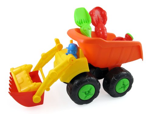 -. Feature : Colorful bulldozer dump truck / Sand set includes shovel, sifter, water pail, castle mold, and driver figure / Truck measures 18" long / Safe and sturdy plastic construction / Perfect for beach or sandbox play!