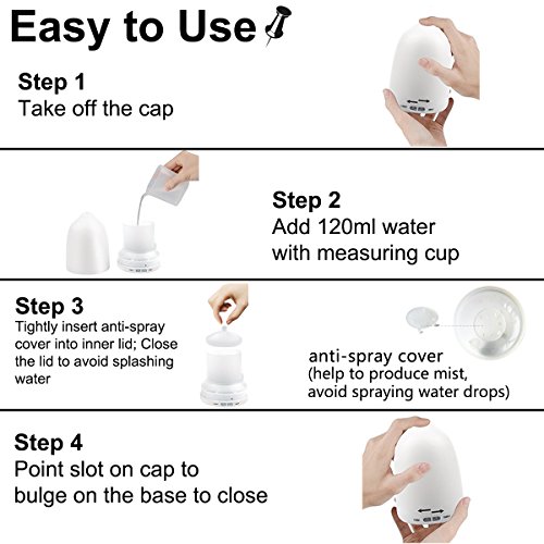 Studio : Avaspot Publisher : Avaspot Binding : Misc. Product Description Avaspot Features: ** Elegant and cute design ** Waterless auto off for safety ** 7 colors LED light changing or stady on ** BPA free material healthy for all people ** Two mist mode to last different time ** Purifying air, diffuse fragrance, enhance mood,suitable for office, bedroom, yoga, spa, etc. Warm Notice: ** Oil is not included in the package. ** Tap water is the best choice. ** Please don't touch the internal ultrasonic wave vibration board inside of the water tank directly with your ? hands. ** Please close the inner transparent lid to avoid splashing water before closing the outer dome. ** After a long term use, the mist outlet will be blocked by water vapour. To blow or shake it can help. Specifications: Material: PP,ABS Capacity?of?water?tank:?120ml Input:AC?100-240V?50/60HZ Output:DC?24V,0.65A Package Includes: 1 x Avaspot?Aroma?Diffuser 1 x?Wall?Charger 1 x?Measuring?Cup?for?Filling?Water 1 x?User?Manual 0
