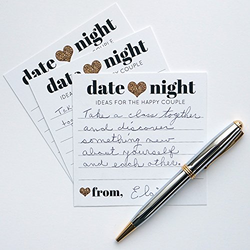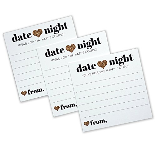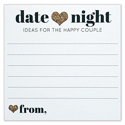 Studio : Wedding Advice Cards Publisher : Wedding Advice Cards Binding : Office Product Product Description Glamorous gold and black "Date Night Ideas for the Happy Couple" cards. These printed flat cards can be used to make a date night jar game for guests to contribute their romantic date night ideas. Perfect for Bridal Showers, Bachelorette Parties, Couple's Anniversary, Engagement Party Weddings. Guests can sign their name on the cards at from and use the blank white back of the card if they need more room to write. (Printed Image - NOT REAL GLITTER). Flat card, Size 4" x 4" inches square, printed one-side, Matte card stock. Pack of 40. 0