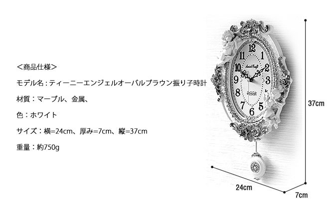 - モデル名:ゴ―ルド エンジェルオーバル振り子時計w電波時計- 材  質:マーブル、金属- カラー :ホワイト- 規  格:横24cm * 幅7cm * 高さ37cm- 重   量:750g