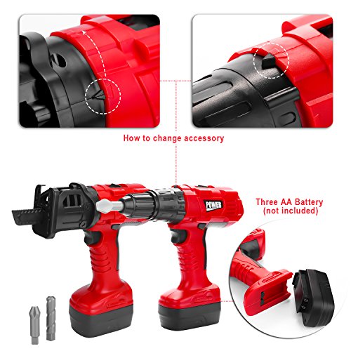 REALISTIC TOOL FUNCTIONS: Every tool accessory piece is produced according to the real production prototype included the product scale as well as the application methods. The tool set contains an electric drill which is battery-powered, it generates a realistic drilling noises due to the internal structure of the drill toy is modeled after a real electric drill.