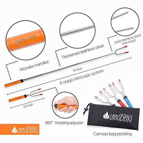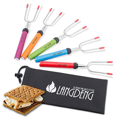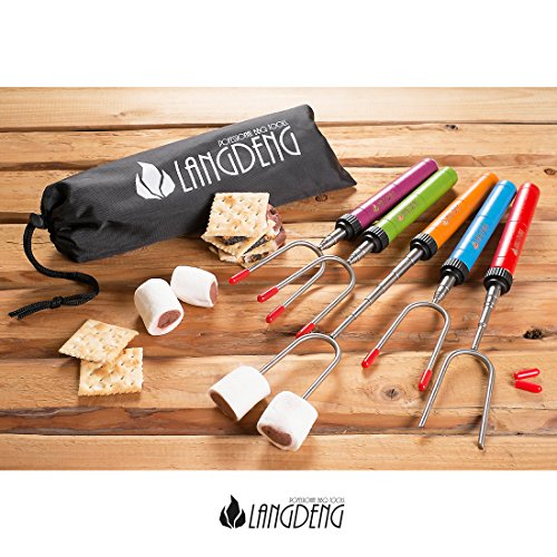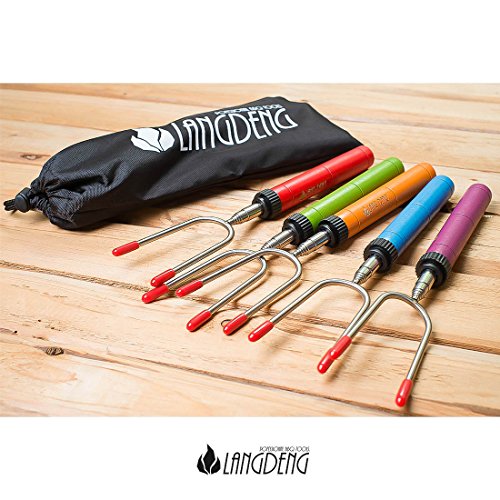 Langdeng Marshmallow Roasting Sticks,Extendable 34'' Telescoping Stainless Steel Forks,Set of 5 in Multi-color and Used in Fire Pit, Camping, Campfire, Bonfire Kids.Great for Marshmallow,Hot Dogs and