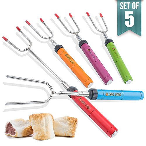 SET OF 5 HIGHEST QUALITY 34 INCH EXTENDABLE MARSHMALLOW ROASTING STICKS- Sturdy FDA approved forks use Non-Toxic stainless steel to ensure safe roasting. Telescoping retracting fork design convenient for camping trips, fishing trips, backpacking or storing at home!