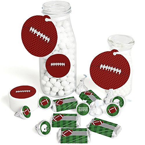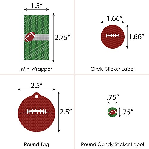 - VARIETY OF STYLES & SIZES! Football Baby Shower or Birthday Party Favor Kit includes stickers and tags to help you create numerous party favors. Mini Candy Bars (20 wrappers, 1 3/8 inches wide x 2 5/8 inches high, fits Hershey® miniature candy bars); Circle Sticker Labels (24 stickers, 1 2/3 inches diameter) 20 Round Tags (2 ½ inches diameter, die cut & ready to use), and Round Candy Labels (108 small round stickers, .75 inches diameter, fits Hershey® Kisses® or other small, round candy).