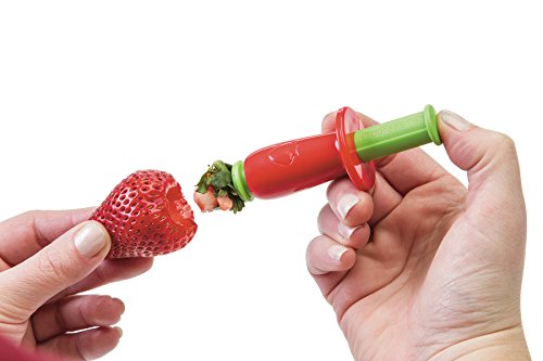 The Prep Solutions by Progressive Push 'n Spin Strawberry Huller removes strawberry leaves, stems and pits with the push of a button