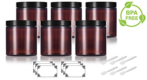 - Includes 6 - 8 oz / 250 ml Amber PET BPA Free Plastic Jars + spatulas and labels for each jar for optional use