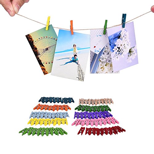 YYaaloa Mini Photo Clips Mini Colored Natural Wooden Photo Paper Peg Pin Clothespins Craft Clips with 32.8ft Hemp String Jute Twine (45-50pcs,...