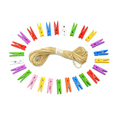 - Package included: 45-50pcs colored craft clothespins (Assorted colors) and 10M(32.8ft) jute twines. The free hemp string is very durable and can strung all the pictures together to form a beautiful routes.