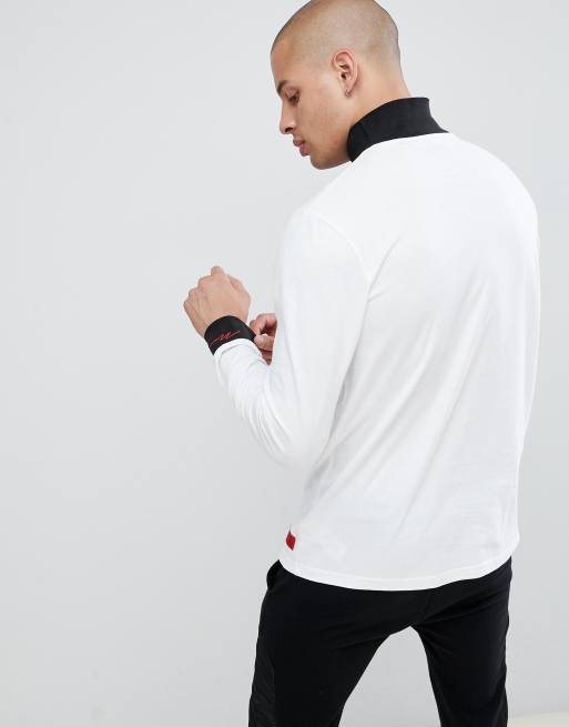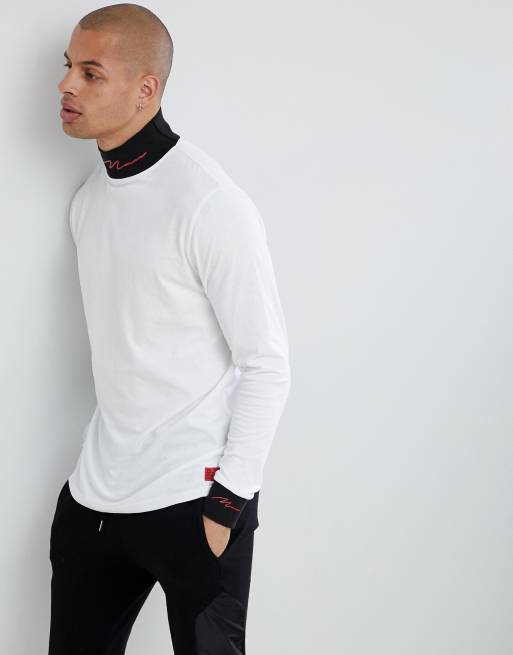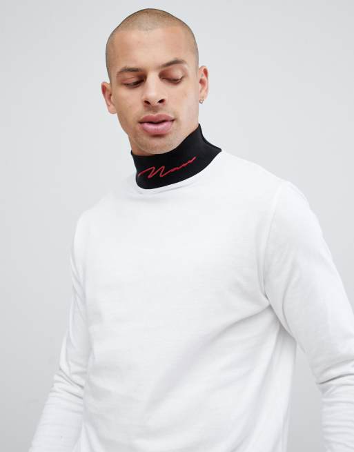 boohooMAN roll neck with contrast collar top in white