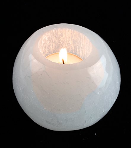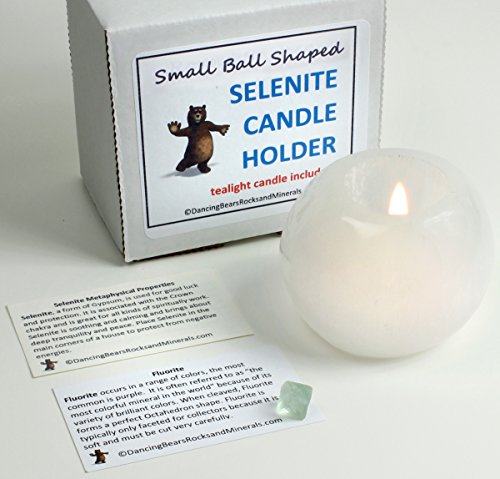 Small Ball Round Shaped Selenite Candle Holder with Tealight candle included. Free Fluorite Octahedron and Educational ID cards. Dancing Bear Brand