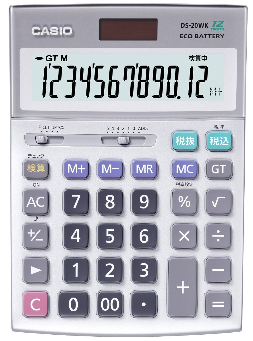 機能:チェック検算,税計算,計算状態表示,マルチ%,√(平方根),四則定数計算,概数計算,桁下げ(シフト),+/-(サインチェンジ),小数の端数処理(四捨五入/切り捨て),小数の端数処理(切り上げ),小数点セレクター,キーロールオーバー機能(早打ち機能),ツーゼロキー