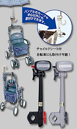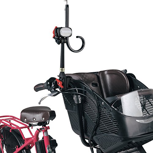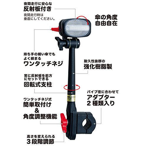 3段階の高さ調節ができ、傘を使用しない時は下向きに固定できる傘キャッチ。傘の取り外しは特殊ネジでワンタッチ。もち手の細い傘でもよく締まる。細径パイプ取付用と太径パイプ取付用の2種類のブラケット付。(取付パイプ径22~30mmまで。22mm以下のパイプには付属のゴム板を挟んで下さい。)粘り強く耐久性抜群のカーボン・グラス繊維入り強化樹脂製。ハンドルの中心以外に。カーブのところにも取付可。チャイルドシート付き自転車、シルバーカーに取り付け可能。