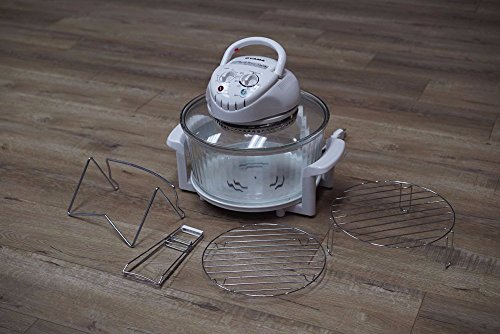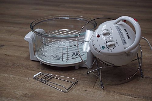 Able to Bake, Grill, Steam or Roast;Attractive, easy to clean glass;12 liter tempered heat resistant glass cooking bowl provides ample cooking space for a variety of foods;Separate dials for setting temperature and cooking time;2 Wire cooking racks, plate tong and instruction manual with recipes included