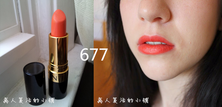 677 柔橘siren 比750亮一些的正橘色 最热卖色号~实际上色受唇色影响,如唇色偏红擦上也偏红。