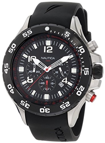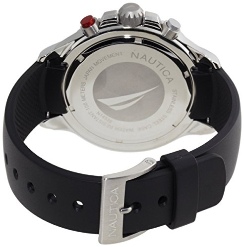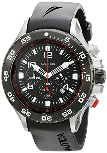 Amazon.com Product Description The Nautica Men's NST Chronograph Watch features three unique subdials for enhanced utility. Constructed with a stainless steel case, the timepiece includes a unidirectional silver-tone bezel with white Arabic minute indexes and a black resin wristband with an adjustable buckle clasp. A tough mineral window shields the black dial, which features bold white Arabic numeral indexes at even intervals. The hour markers are capped with white Arabic numeral indexes that clock the minutes in increments of five. The dial is encircled by a gray tachymeter and includes white minute indexes, a date calendar at four o'clock, and three white chronograph subdials. Powered by analog-quartz movement, the watch is water resistant to 330 feet. 0