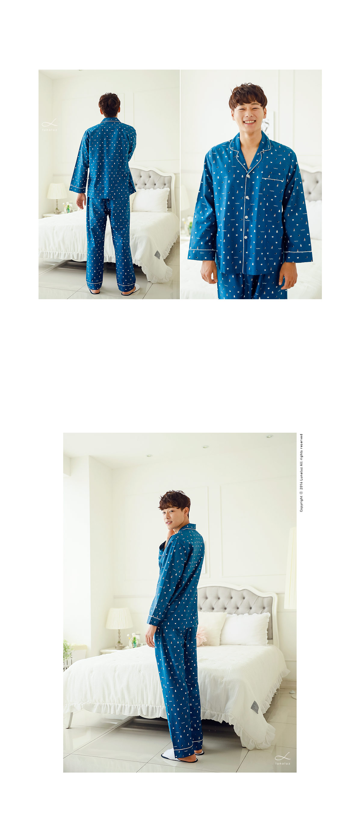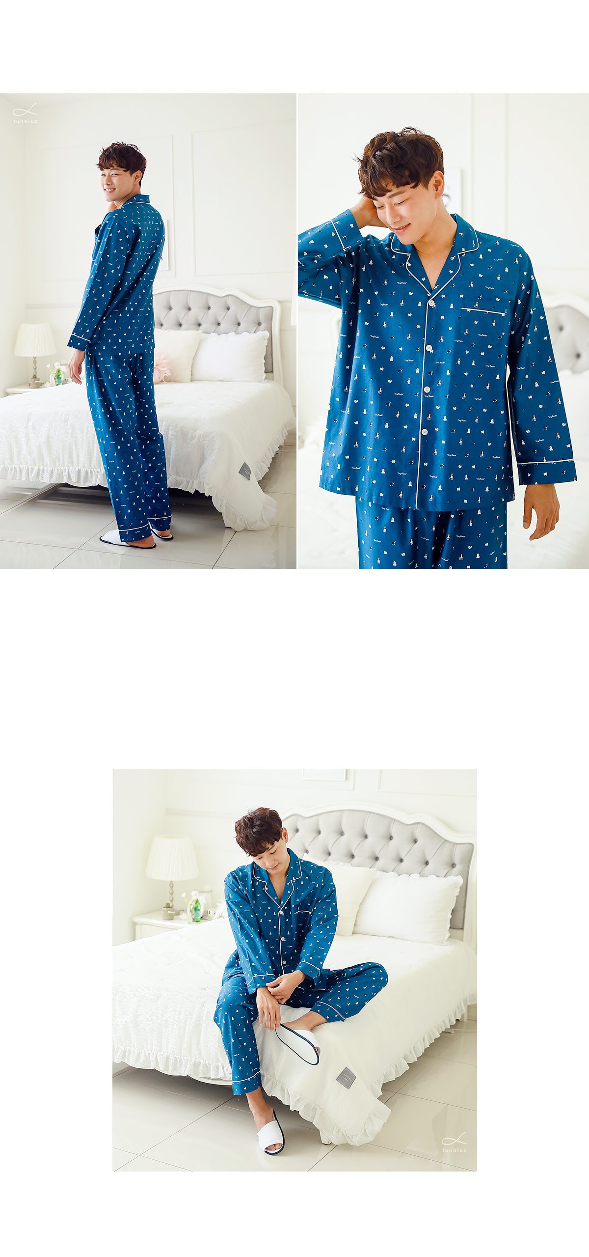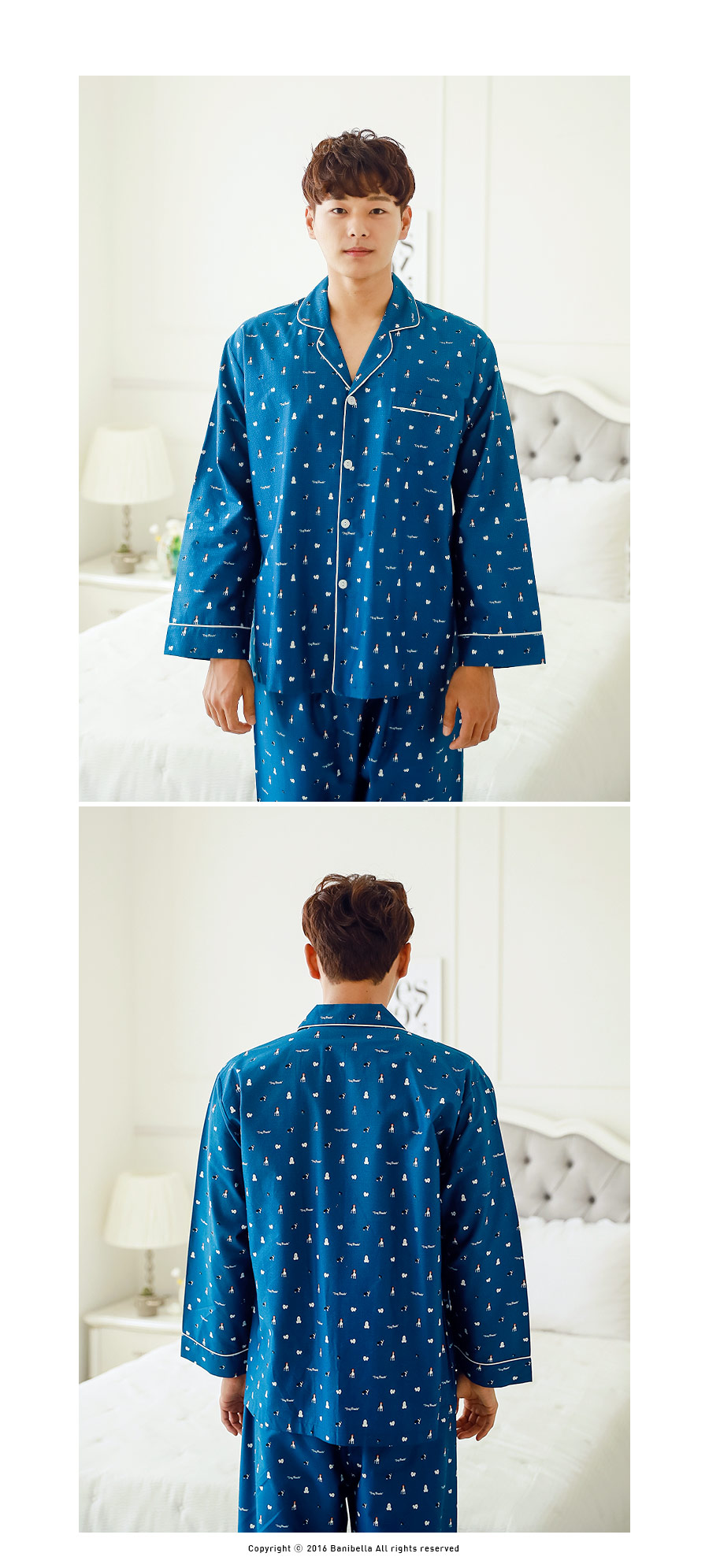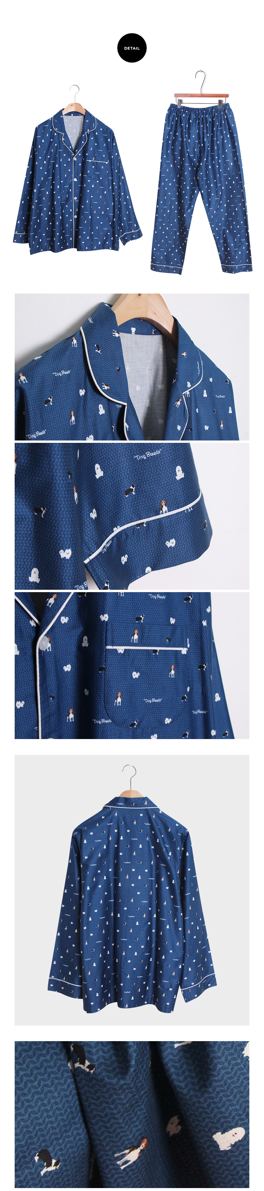 분위기 있는 네이비 베이스 위에 지문을 깔아 밋밋하지 않고 더욱 고급스럽게 내어주었습니다. 그 위에 귀여운 강아지 프린팅으로 포인트를 주었는데요. 포인트 되어주는 프린팅까지 고급스러우면서 분위기까지 살려주니 더 더~ 추천해드리고 싶습니다~! 카라넥으로 제작하고 아이보리컬러 삥줄을 둘러주어 깔끔하게 포인트를 주었습니다. 소매 부분과 팬츠의 하단에도 삥줄을 둘러주어 더 예뻐요. 전체적으로 고급스러우면서 발랄한 느낌을 주는 디자인과 디테일입니다.^^ 커플로 입어도 더욱 예쁘게 연출된답니다. 원단에 고급스러운 광택이 살짝살짝 돌고 피부에 닿는 느낌이 좋아 숙면을 취하시기 좋습니다. 100% 국내 제작으로 내구성과 퀄리티가 좋습니다.